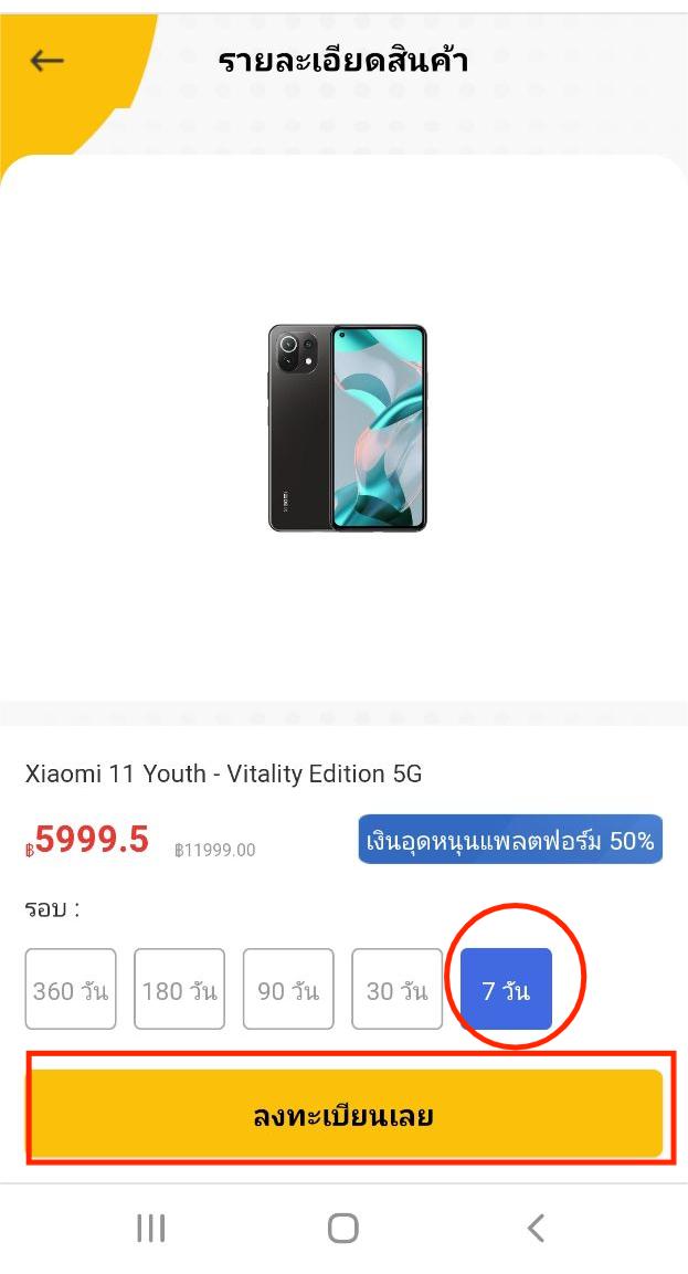 คลิกผลิตภัณฑ์ Xiaomi 11Youth-Vitality Edition 5G เลือก 7 วัน คลิก "ชำระเงินทันที"